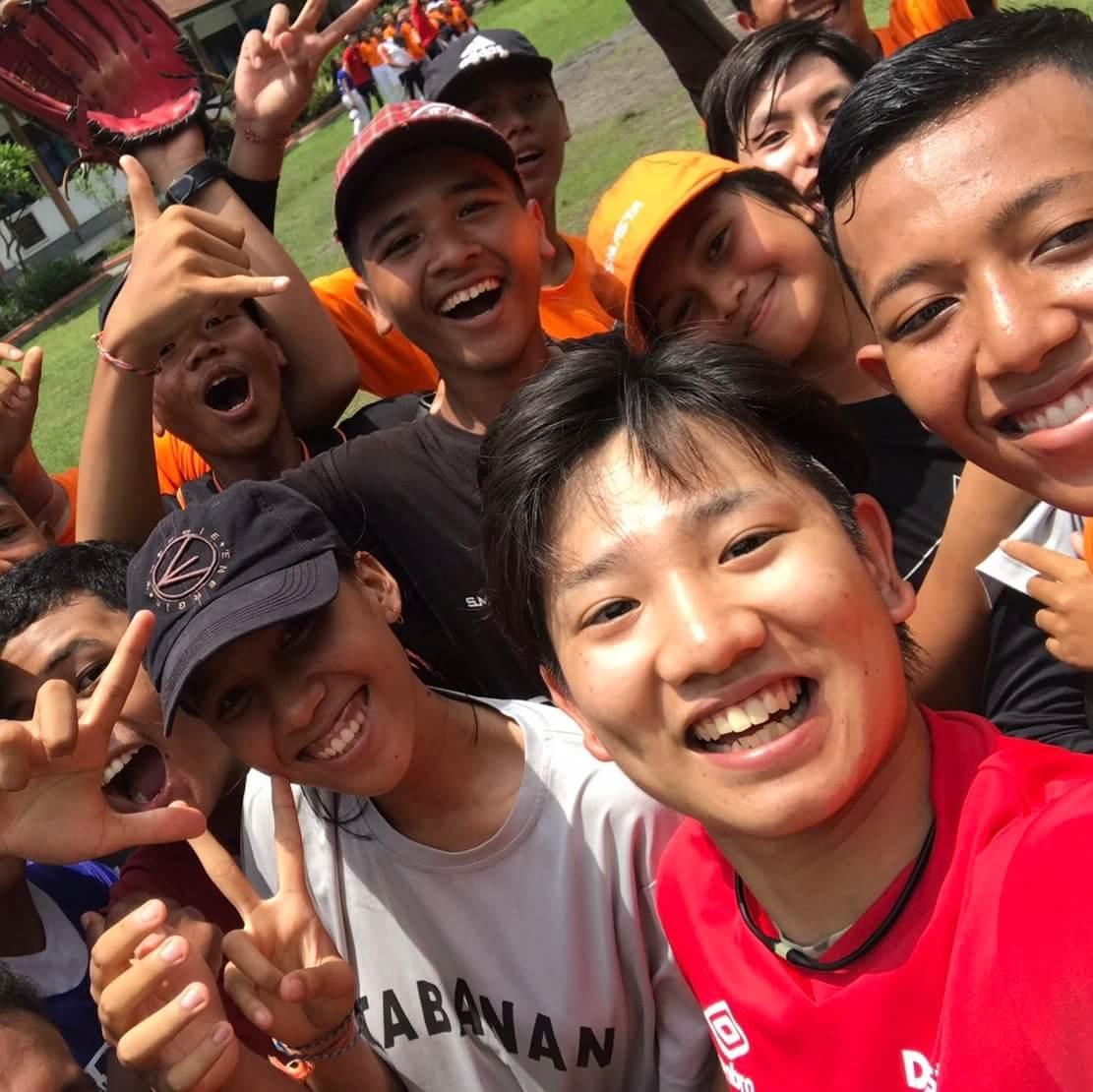 出会ったその場で野球ごっこをスタートしたり、ガジャマダ大学内の広場、世界遺産であるプランバナン遺跡を見学に来ていた小学校の団体、高校生の団体と野球を。幼い子供たちと柔らかめの安全なボールでキャッチボールを楽しみ、溢れる笑顔が印象的でした。